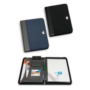 PORTABLOCCO CON CERNIERA IN SINTETICO STAMPATO E DORSO COLORATO, VARI SCOMPARTI INTERNI, COMPLETO DI BLOCCO. F.TO 35X25CM.