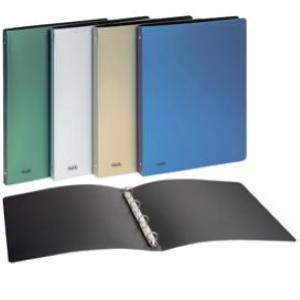 REALIZZATI IN POLIPROPILENE OPACO CON FINITURA AD EFFETTO METALLIZZATO ED INTERNO DI COLORE NERO. COPERTINA FLESSIBILE. 4 COLORI ASSORTITI: VERDE, ARGENTO, ORO E BLU. FORMATO INTERNO 22X30CM. 4 ANELLI TONDI DIAM 15MM.